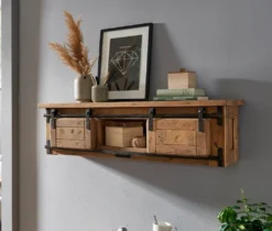 Nicht nur lassen sich auf dem Wandregal aus Massivholz die unterschiedlichsten Dekorationsartikel platzieren, die dem Raum zusätzlich Leben einhauchen, sondern es lassen sich auch Kleinigkeiten in den insgesamt drei offenen Fächern verstauen, die von gleich zwei eleganten Schiebetüren auf Eisenleisten verschlossen werden können.