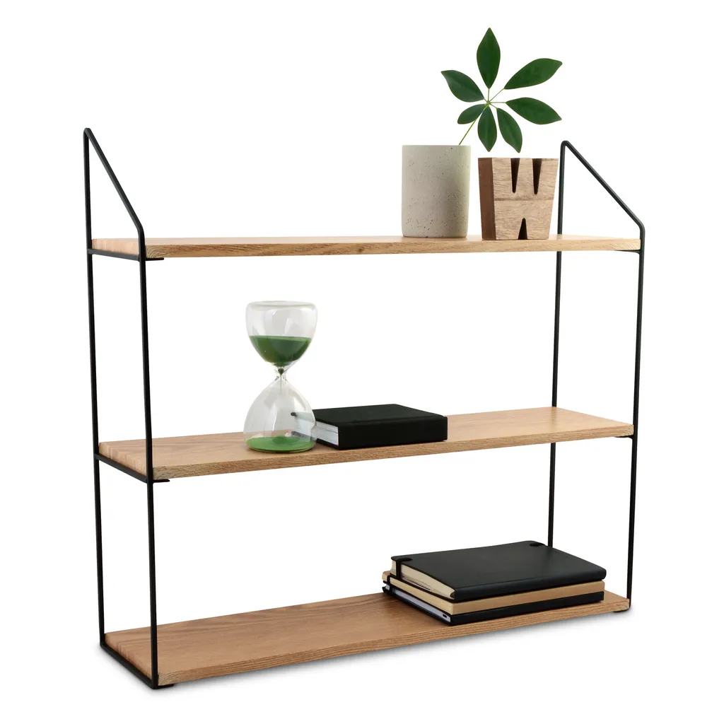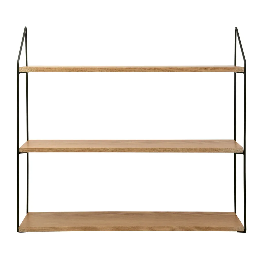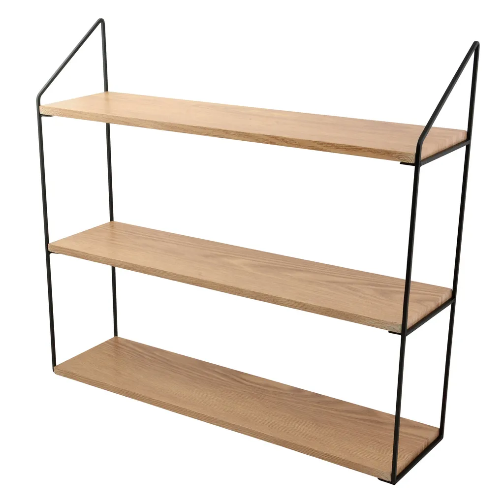 Schönes Wandregal mit schwarzem Metallrahmen und natürlicher Holzoptik. Die drei Ablageflächen aus mit PVC beschichtetem MDF-Holz bieten jede Menge Platz zum Aufbewahren von Büchern oder zum Präsentieren von Blumen etc.. Das trendige Regal wurde im angesagten Industrie- und skandinavischen Einrichtungsstil gestaltet.