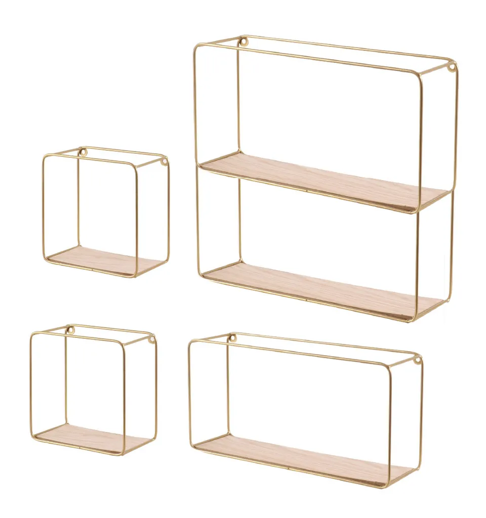 Vielseitig einsetzbare Regale aus Metall gold lackiert und Holz im 4er Set mit 3 verschieden großen Regalen