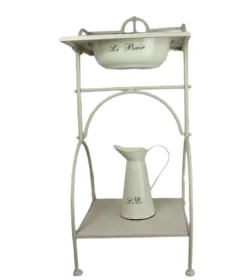 Waschtisch, Waschtischset, Badezimmertisch mit Schüssel und Kanne aus Emaille, die Schweißnähte können minimal Flugrostig sein. Der Wandtisch ist im Antikstil gearbeitet, die farbliche Fassung wirkt unterschiedlich und somit sehr antik, an den Schweißstellen kann das Gestell Flugrost ansetzen. Sie können den Tisch mit unseren zahlreichen Badezimmer Artikeln aus Emaille zusätzlich bestücken.. Das Waschtisch sieht sehr betagt aus, mit allem Pipapo was zu alten Emaille Gegenständen gehört (kleine Abplatzungen, Fehlstellen usw.) Der Artikel mit seinem antiquarischen Erscheinungsbild ist aus antikweissem emalliertem Stahlblech gefertigt. Farblich gibt es bei den Artikeln Unterchiede da wir dieses Set verschiedener Hersteller selbst zusammengestellt haben. Abplatzer, Risse, Schrunden und Unebenheiten in den Oberfläche gehören zu dieser Landhausserie und sind bewusst gewollt und stellen keinen Qualitätsmangel dar.