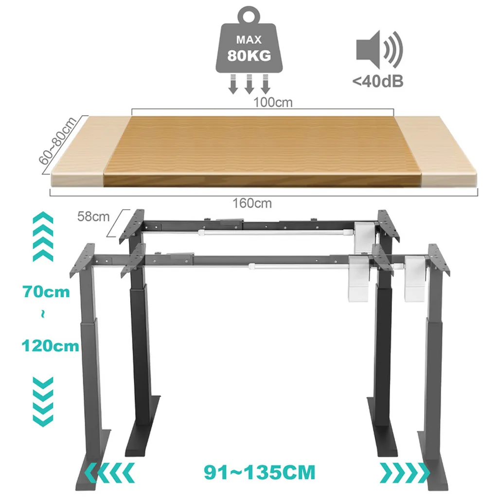 Hoehe und Breite koennen flexibel eingestellt werden:Die Laenge des Rahmens betraegt 91-135 cm und die Breite 58 cm, passend fuer Tischplatte mit einer Groesse von 100*60cm oder mehr . Sie koennen eine Tischplatte besorgen, der fuer Ihre Groesse geeignet ist, um zusammen zu verwenden.Die Hubhoehe betraegt 72cm – 120 cm, was fuer fast jeden geeignet ist.